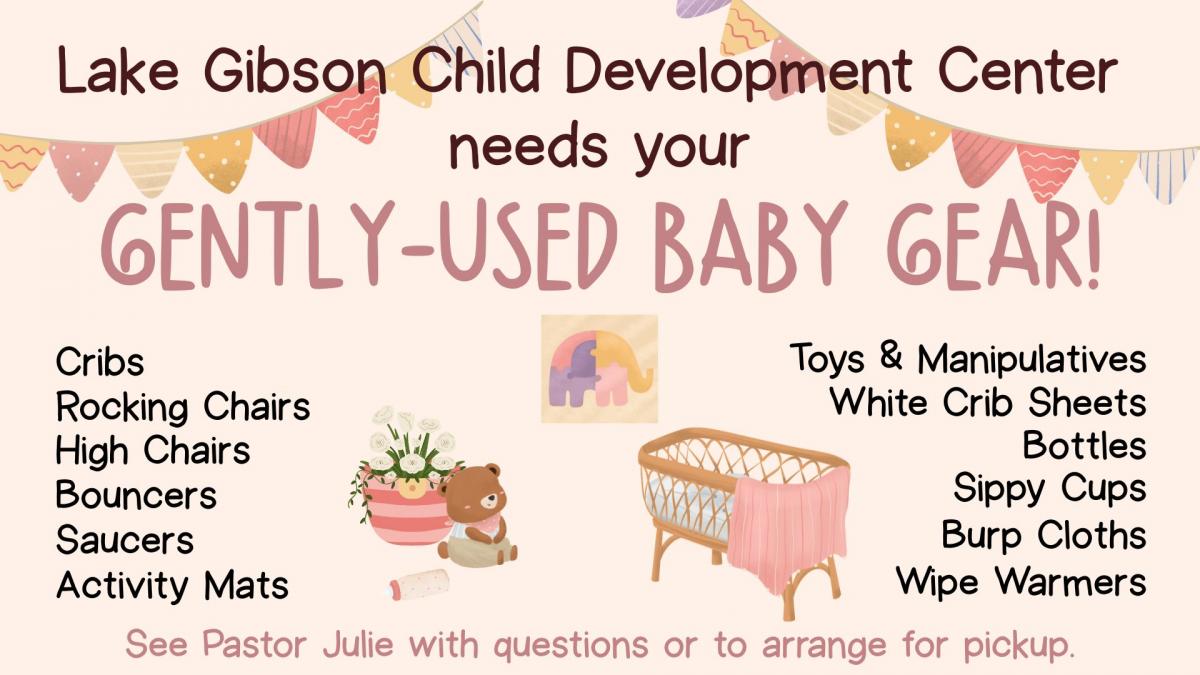 Last Sunday, we introduced Lori Long, the new Executive Director of Lake Gibson Child Development Center (LGCDC). Ms. Long shared the exciting news that LGCDC will start enrolling infants (6 weeks) and one-year-olds! We will open these classrooms in January, but we need your help to get these rooms ready to receive these babies!