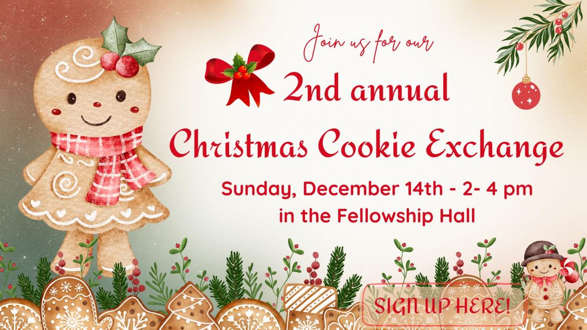 Ladies, Mark your calendars (Dec. 14, 2 - 4pm) and bring 3 dozen cookies to share! Join us for fellowship, laughter, and sweet holiday fun as we swap treats and encourage one another during this joyful season. Light refreshments will be served!