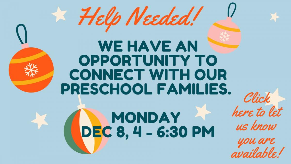 Join us for Christmas Crafts & Connect with our preschool/aftercare families! Come help us Monday, Dec. 8 from 4 - 6:30 pm. We'll be serving treats and making ornaments!
