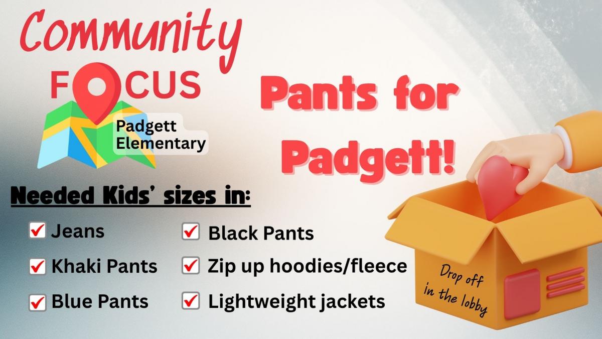 It’s getting chilly out! We’re collecting new or gently used jeans, khaki, blue, or black pants and zip-up hoodies/fleece along with light jackets for students at Padgett Elementary. Your donations make winter warmer for those in need!
